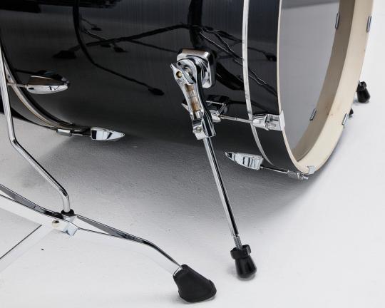 Die Tomhalterung ist mit Kugelgelenken ausgestattet die es ermöglichen, die Toms stufenlos zu neigen und optimal zu positionieren. Bestückt sind die Trommeln mit einlagig, klaren Fellen auf den Toms und ein weiß aufgerautes Schlagfell auf der Snare. Das Schlagfell auf Bass Drum ist mit Dämpfungsring ausgestattet, und damit einen satten Bass Drum Sound erzeugt. Die Bass Drum verfügt außerdem über Holz Spannreifen, die sind nicht nur robust, sondern verleihen den Drumset eine hochwertige Optik.