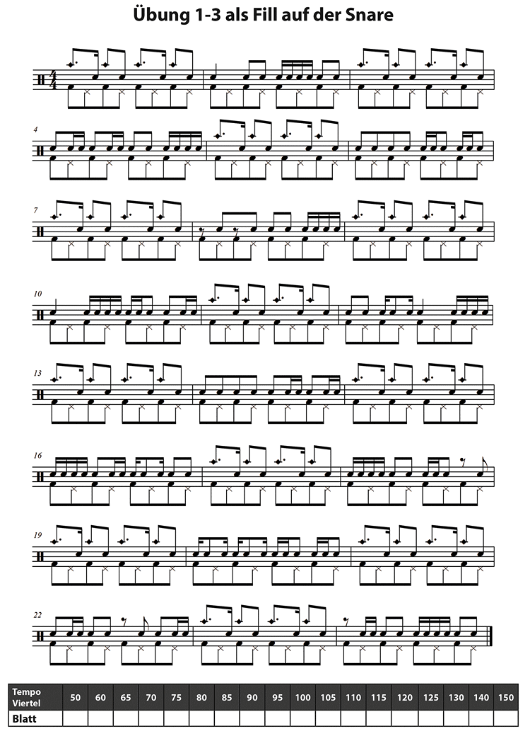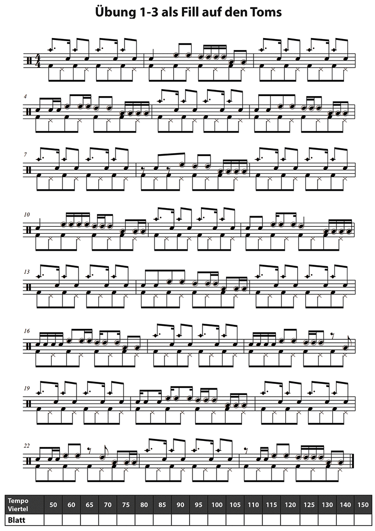 - Blatt 3: Hier werden die Fills auf Blatt 2 über die Toms gespielt.