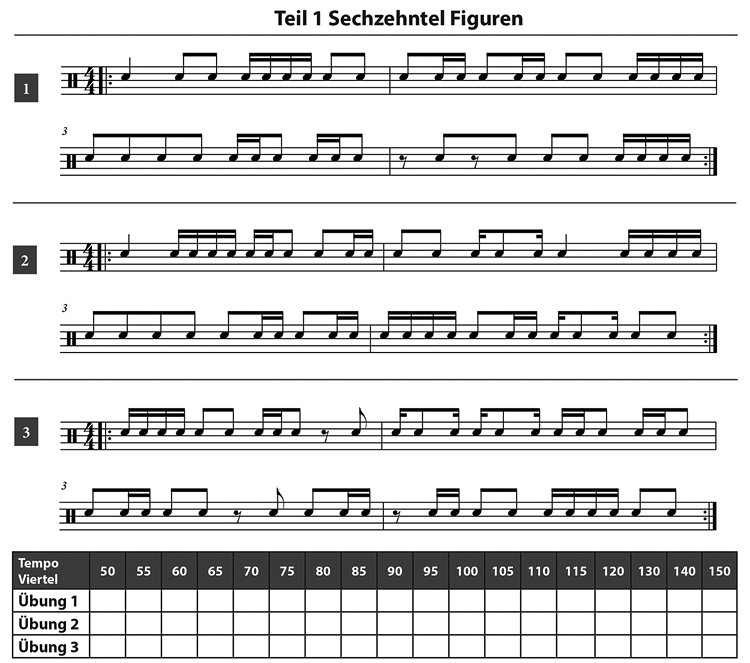 - Wenn alle Übungen gut funktionieren wieder das erste Blatt spielen und versuchen das Tempo weiter zu steigern, das gleiche auch mit Blatt 2 und 3.