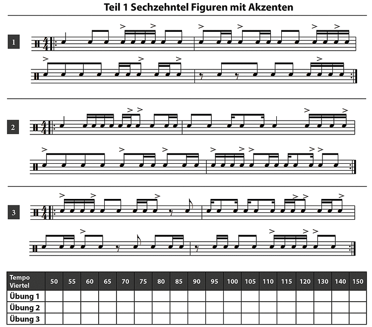 In Teil 2 werden die Sechzehntel und Achtel Noten des ersten Teils mit Akzenten ergänzt.