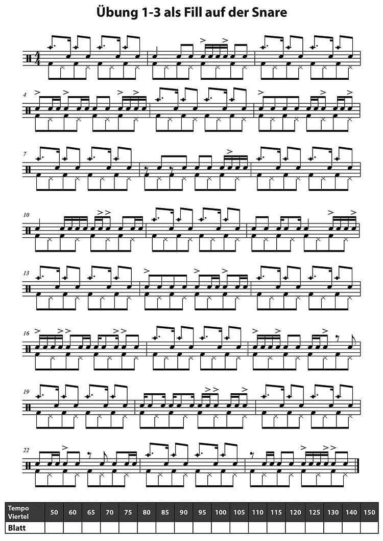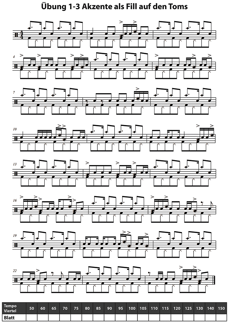 - Blatt 3: Hier werden die Akzente auf Blatt 2 über die Toms gespielt.