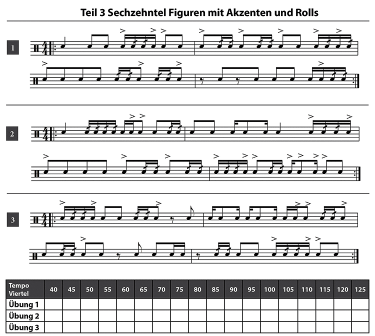 In Teil 3 werden die Sechzehntel Figuren des ersten und zweiten Teils mit Doppelschlägen ergänzt.