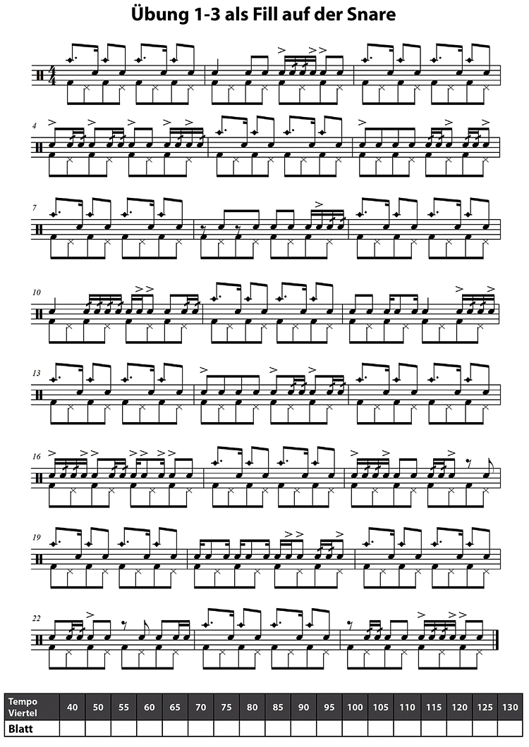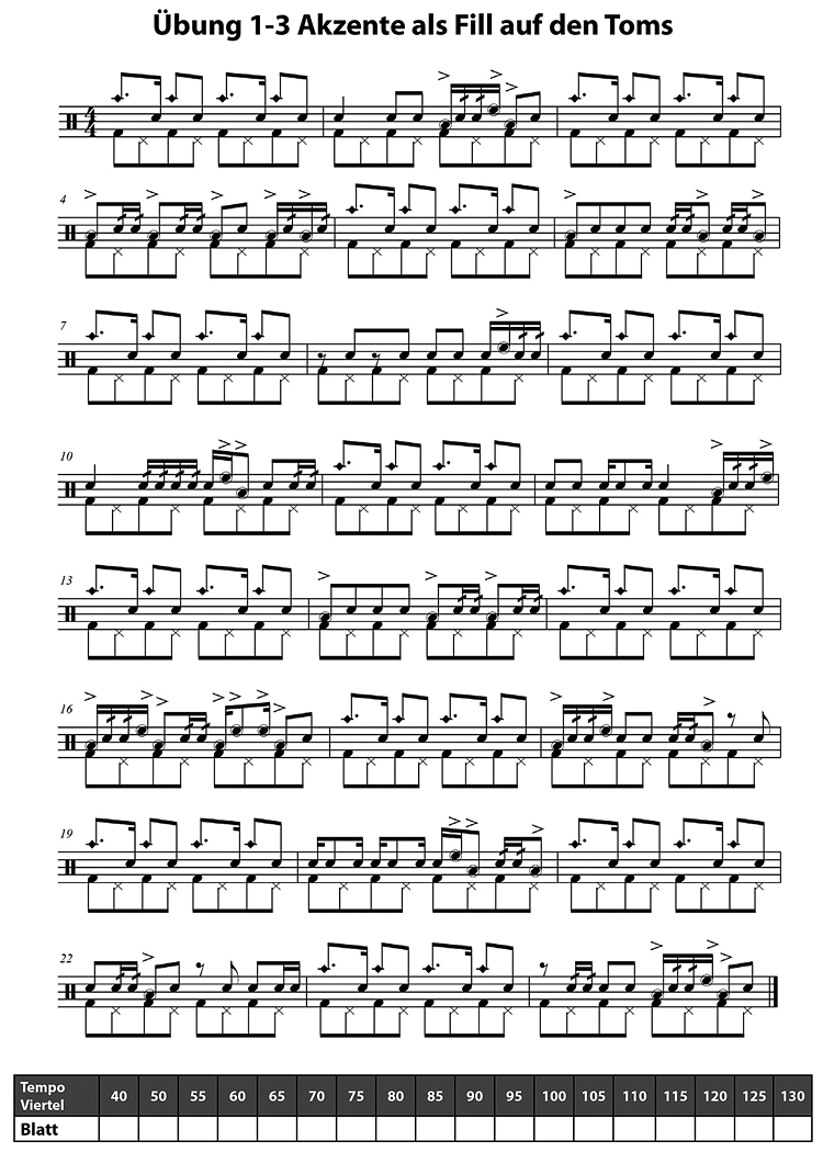 • Blatt 3: Hier werden die Akzente auf Blatt 2 über die Toms gespielt.